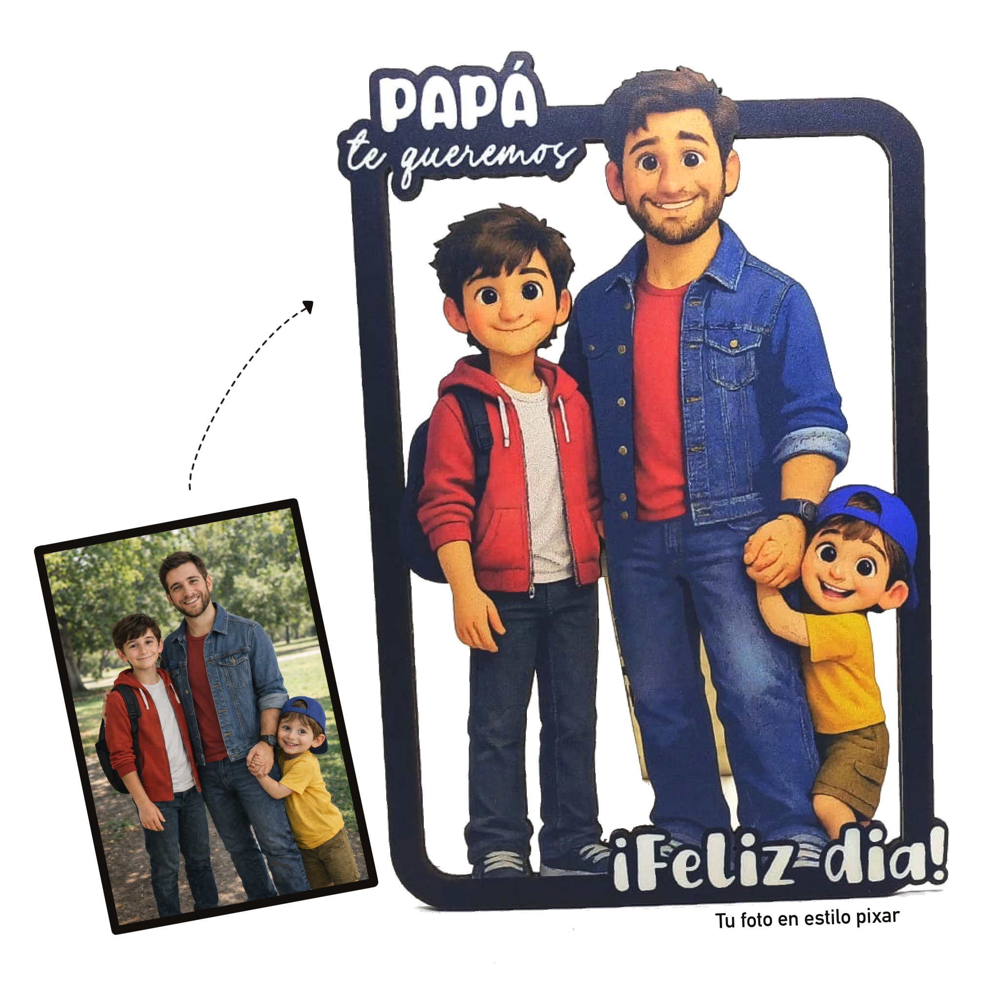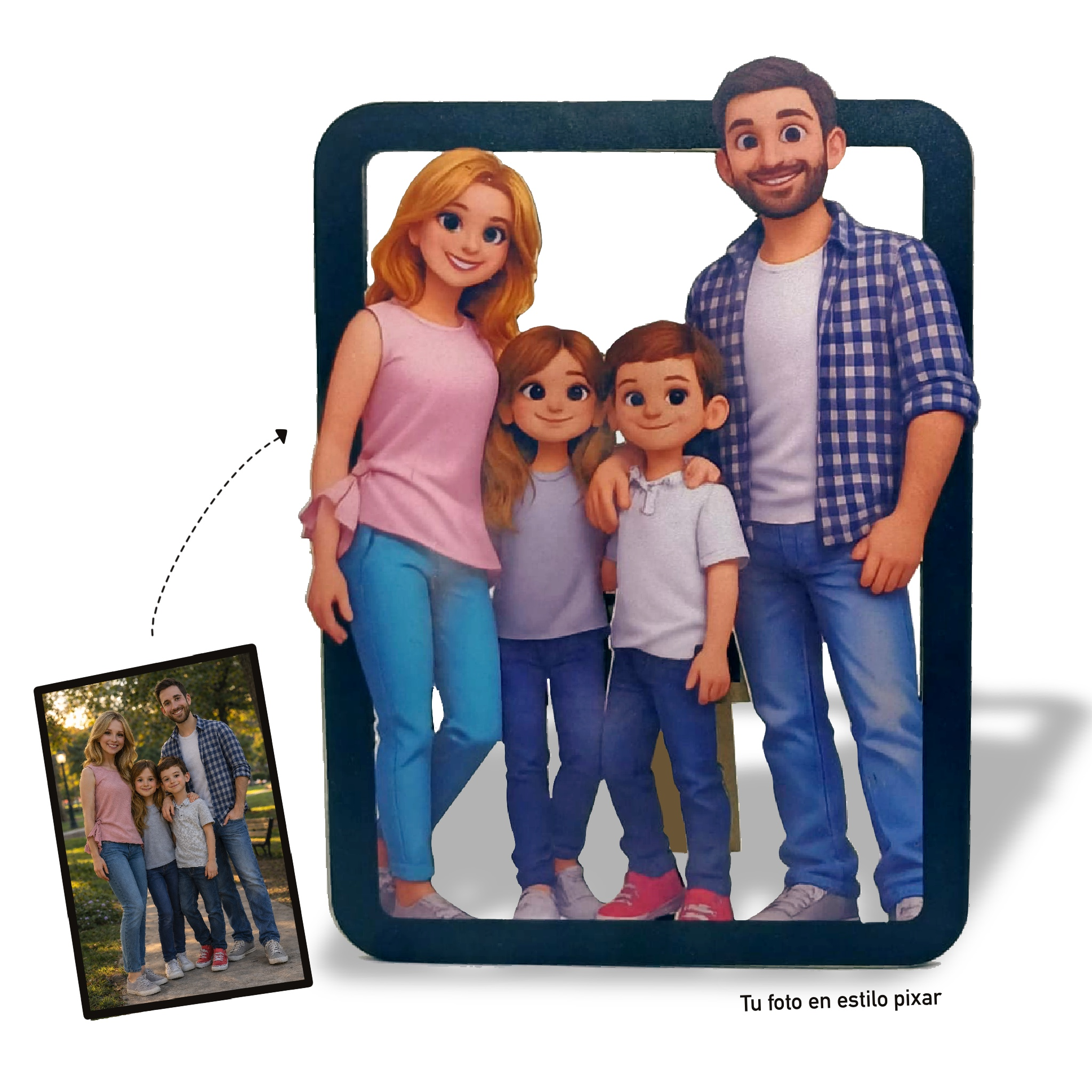 16,50€ IVA incluido Añadir al carrito16,50€ IVA incluidoLetrero personalizado de madera con tu foto familiar en estilo Pixar. Creamos una ilustración única a partir de tu imagen y la convertimos en una figura decorativa con marco, ideal para regalar o decorar tu hogar. Un detalle original, emotivo y totalmente personalizado.